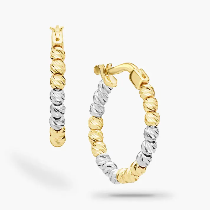 חישוקי ונציה עשויים זהב 14K צהוב ולבן, מקולקציית ה- GOLDEN GLOW החדשה השומרת על קווים קלאסיים ובעיצוב עכשווי. העגילים עשויים כדורי זהב. קוטר החישוקים 1.8 ס"מ.