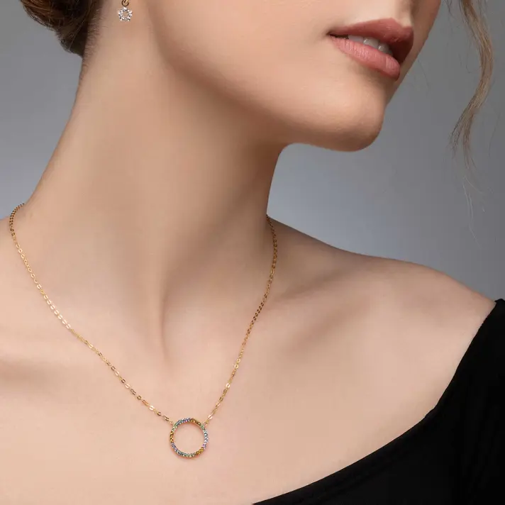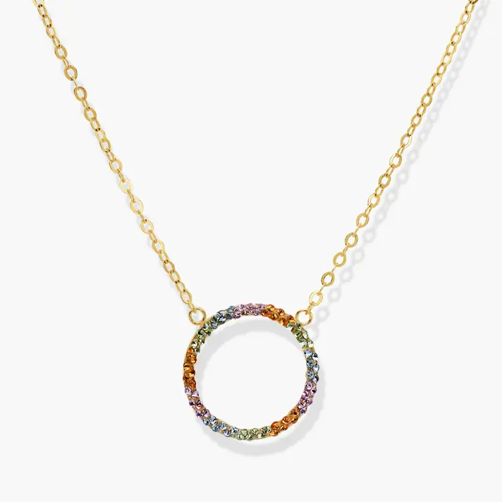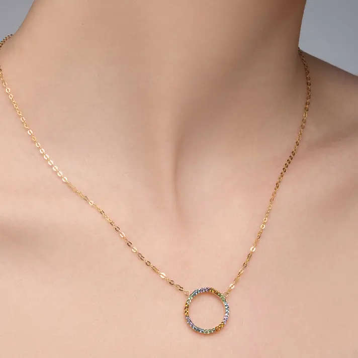 שרשרת זהב 14K עם תליון עגול בקוטר 1.8 ס"מ המשובץ באבני חן צבעוניות. אורך השרשרת 42 ס"מ + 4 ס"מ הניתנים להארכה.