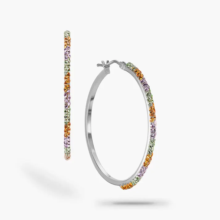 עגילי חישוק בזהב 14K משובצים באבני סברובסקי צבעוניות ונוצצות. קוטר העגילים 3.5 ס"מ.