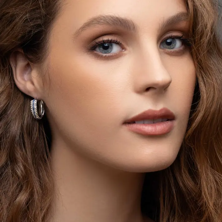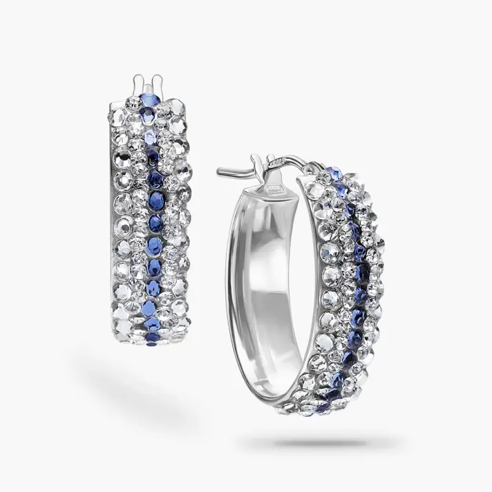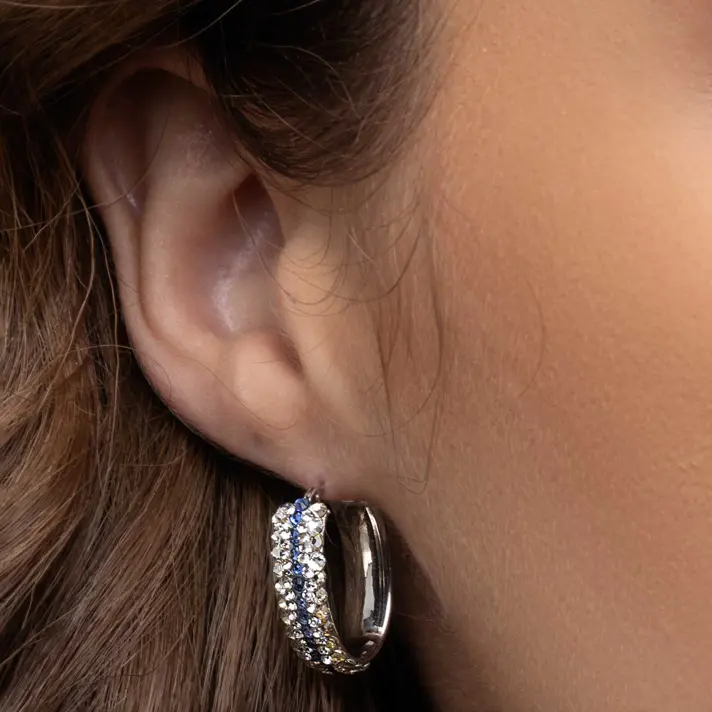 עגילי חישוק בזהב 14K משובצות אבני סברובסקי נוצצות. גובה העגילים 1.9 ס"מ.