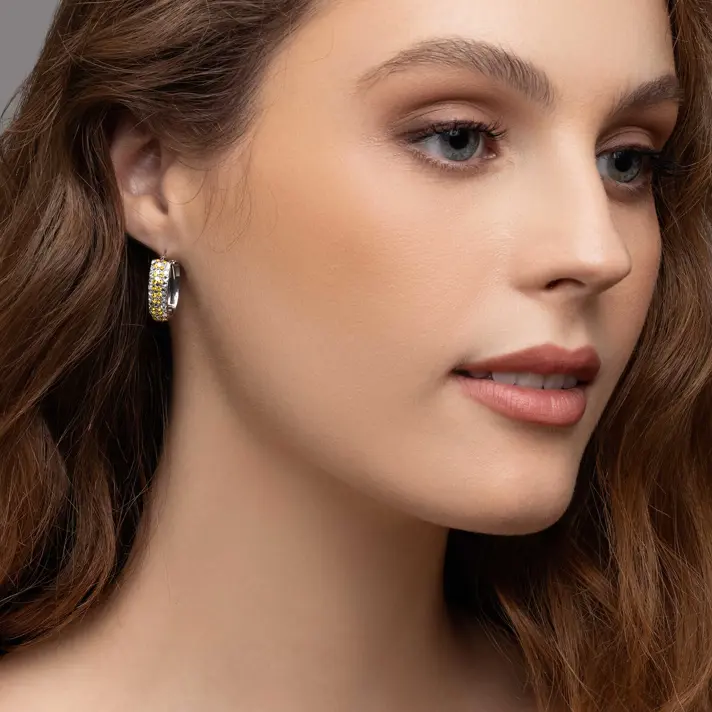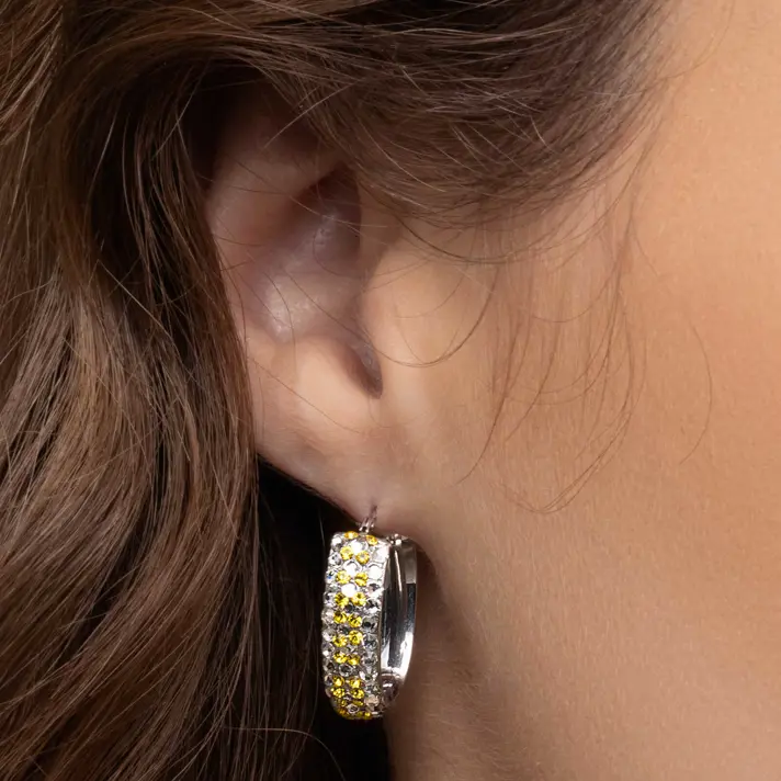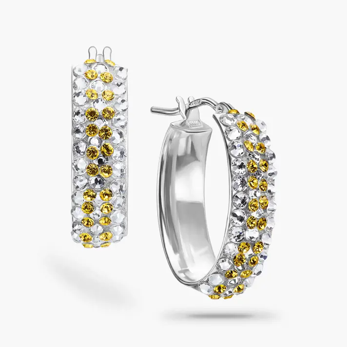 עגילי חישוק בזהב 14K משובצות אבני סברובסקי נוצצות. גובה העגילים 1.9 ס"מ.