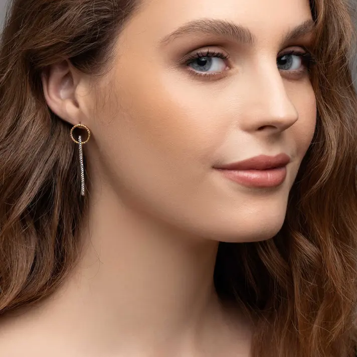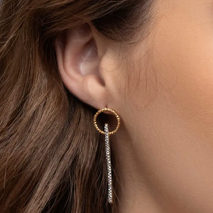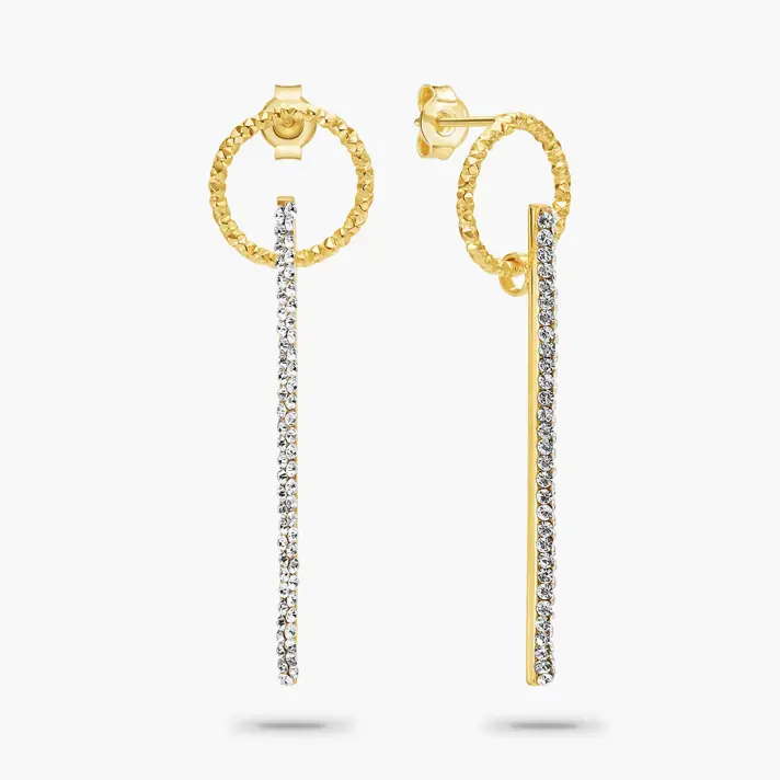 עגילי זהב 14K עם חישוקי זהב בריקוע לייזר בקוטר 1.2 ס"מ הצמודים לאוזן ומשהם יוצא פס זהב המשובץ זירקונים נוצצים. אורך העגילים 4.5 ס"מ.