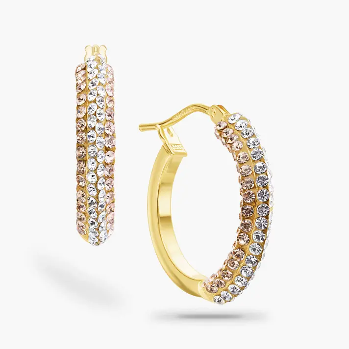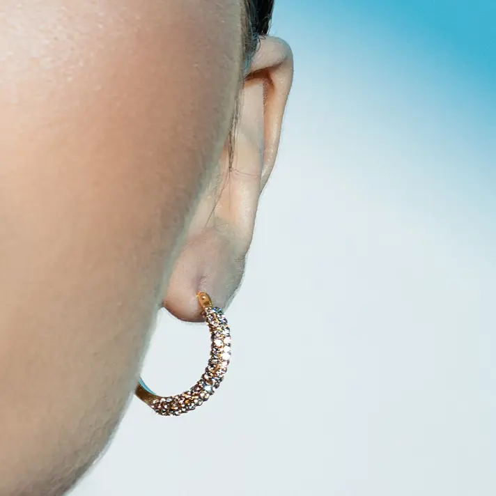 עגילי זהב 14K חישוקים המשובצים 4 שורות של זירקונים לבנים וחומים. קוטר העגילים 2 ס"מ.