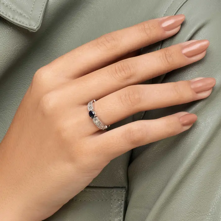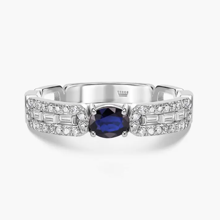 טבעת זהב 14K משובצת ב 46 יהלומים טבעיים ונוצצים בחיתוך באגט יוקרתי ועגול ובמרכז הטבעת אבן ספיר כחולה בחיתוך אובאלי.