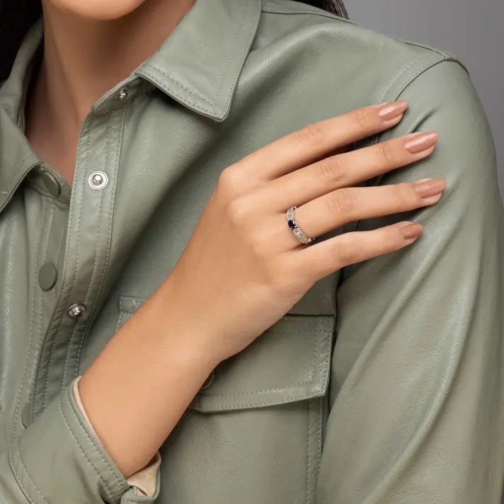 טבעת זהב בשיבוץ יהלומים בחיתוך באגט ואבן ספיר