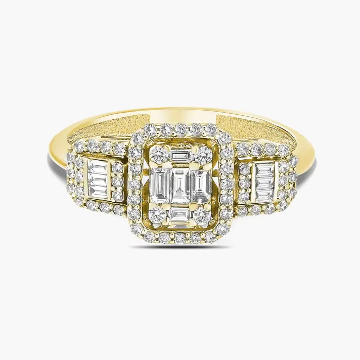 טבעת דייזי עשויה זהב 14K צהוב ומשובצת 73 יהלומים טבעיים ונוצצים, מתוכם 11 בחיתוך באגט היוקרתי.