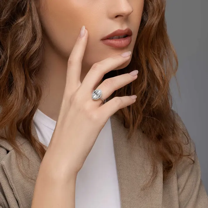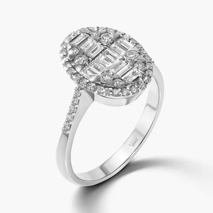 טבעת אמיליה עשויה זהב 14K לבן ומשובצת 59 יהלומים טבעיים ונוצצים מתוכם 12 בחיתוך באגט היוקרתי.