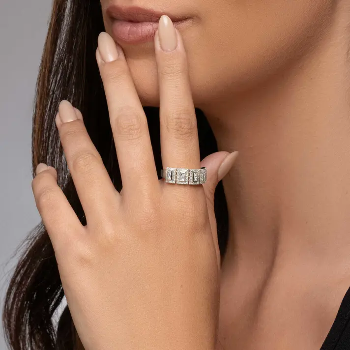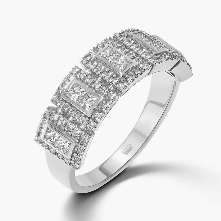 טבעת זהב 14K המעוצבת עם 10 יהלומים יוקרתיים בחיתוך פרינסס המשובצים בתוך 5 צורת מלבנים המוקפים יהלומים בחיתוך עגול. סה"כ משובצים בטבעת 90 יהלומים טבעיים ונוצצים. לפירוט נתוני היהלומים ניתן ללחוץ כפתור נתוני אבני החן. רוחב הטבעת 7 מ"מ.