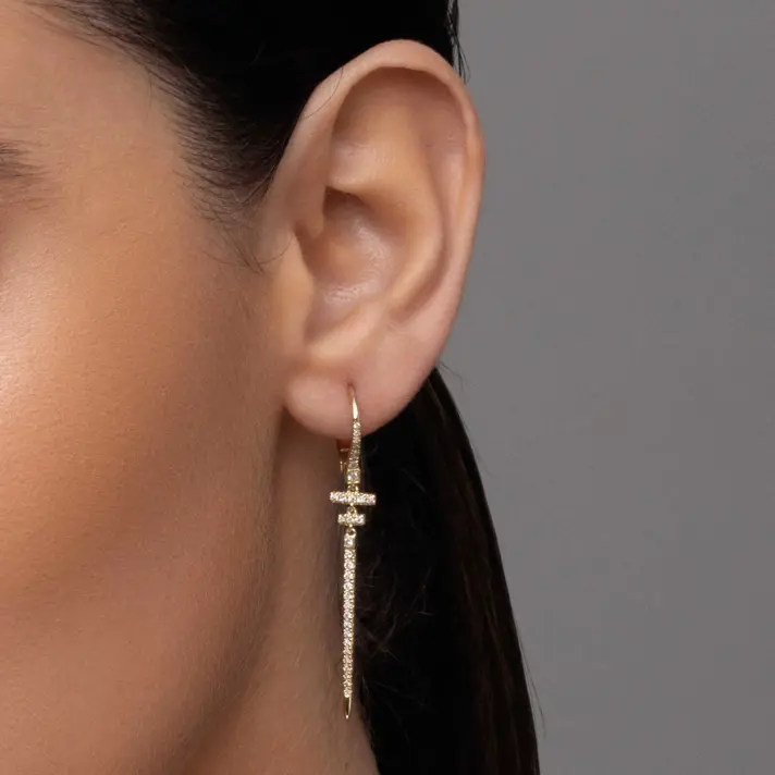 עגילי רוקסן ארוכים עשויים זהב לבן 14K ומשובצים ב 66 יהלומים טבעיים ונוצצים.