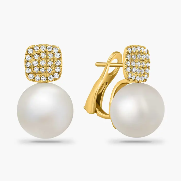 עגילי זהב 14K משובצי יהלומים טבעיים ונוצצים ופניני מים מתוקים עגולות 12 מ"מ.