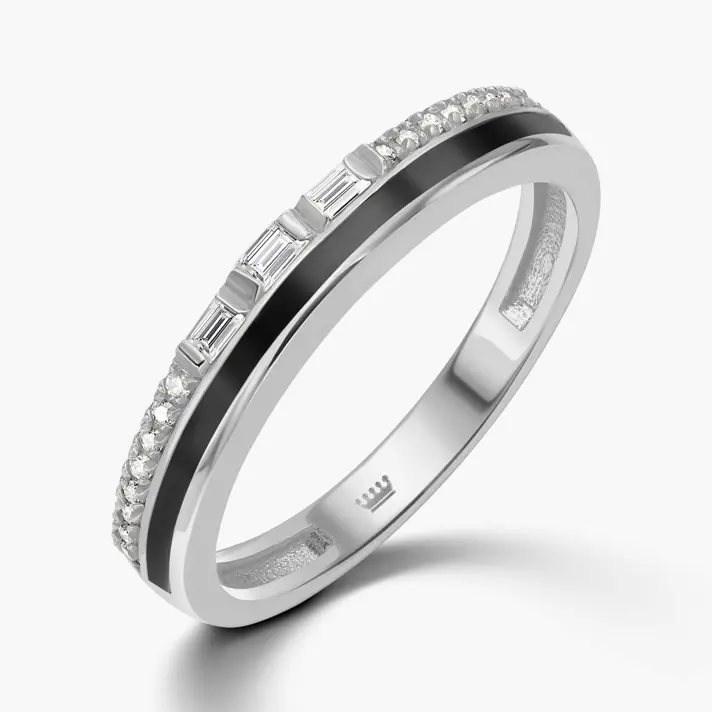 טבעת זהב 14K מסדרת Black Series המשובצת 19 יהלומים טבעיים ונוצצים בחיתוך באגט יוקרתי ועגול ומוקפת אמייל שחור. רוחב הטבעת 2.5 מ"מ.