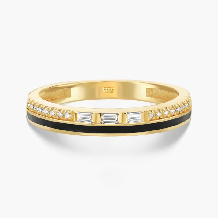 טבעת זהב 14K מסדרת Black Series המשובצת 19 יהלומים טבעיים ונוצצים בחיתוך באגט יוקרתי ועגול ומוקפת אמייל שחור. רוחב הטבעת 2.5 מ"מ.