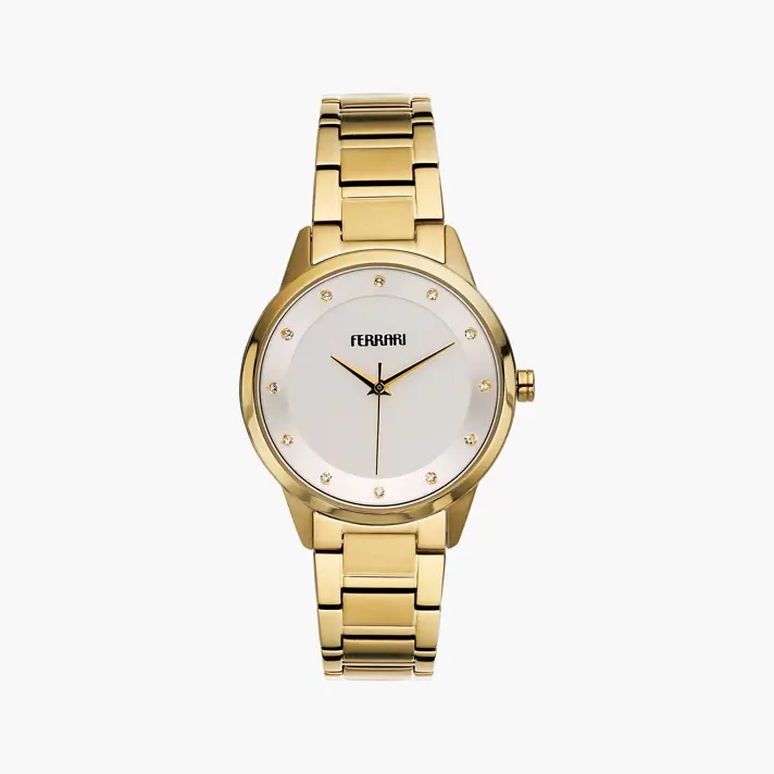 שעון FERRARI אלגנטי לנשים במראה מינימליסטי ונקי למראה מתוחכם ועל זמני. לוח בגוון לבן קלאסי עם סימוני ספרות משובצות זרקונים נוצצים. לשעון צמיד מתכת איכותי בגוון זהוב.