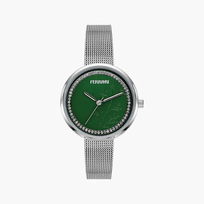 שעון Ferrari לנשים עם לוח ירוק הכולל עיטור עדין של פרחים ומוקף באבני זירקון נוצצות. מחוגי השעון וקופסת השעון בגוון זהב ורצועת השעון מסוג Mesh גמיש - בגוון כסף. קוטר השעון 30 מ"מ והוא עמיד למים לשטיפת ידיים אך לא לבריכה או למקלחת.