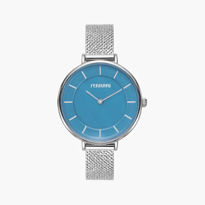 שעון FERRARI אלגנטי לנשים בעל לוח תכלת ורצועת MESH כסופה , ומחוגים תואמים בגוון כסוף.