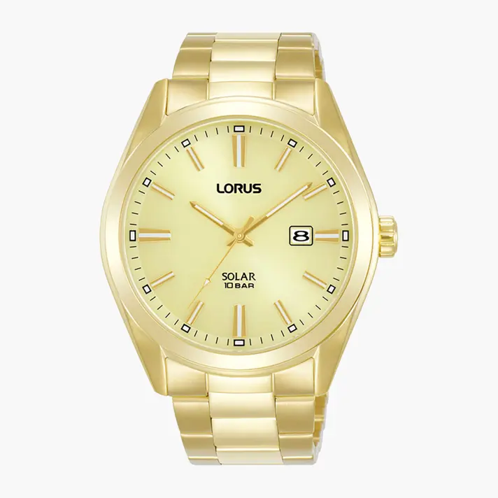 שעון לורוס גברים סולארי המופעל על ידי האור ואינו נזקק לסוללה. לוח השעון בגוון שמפניה עדין, מחוגי השעון והספרות מוזהבות. לשעון רצועת מתכת זהובה איכותית, זכוכית קריסטל מינרלית ועמידות במים עד 100 מטר. קוטר השעון 42 מ"מ.