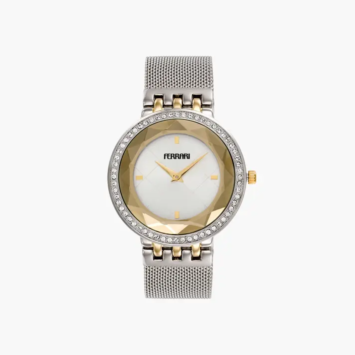 שעון FERRARI אופנתי לנשים עם לוח לבן, סימוני ספרות ומחוגים מוזהבים וטבעת המקיפה את הלוח בחיתוך יהלום יוקרתי. לשעון צמיד מש אופנתי.