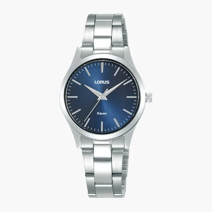 שעון לורוס נשים מבית SEIKO יפן בעל מנגנון קוורץ. לוח השעון בגוון כחול. לשעון צמיד פלדת אל חלד כסוף איכותי, זכוכית קריסטל מינרלית ועמידות במים עד 50 מטר. קוטר השעון 28 מ"מ.