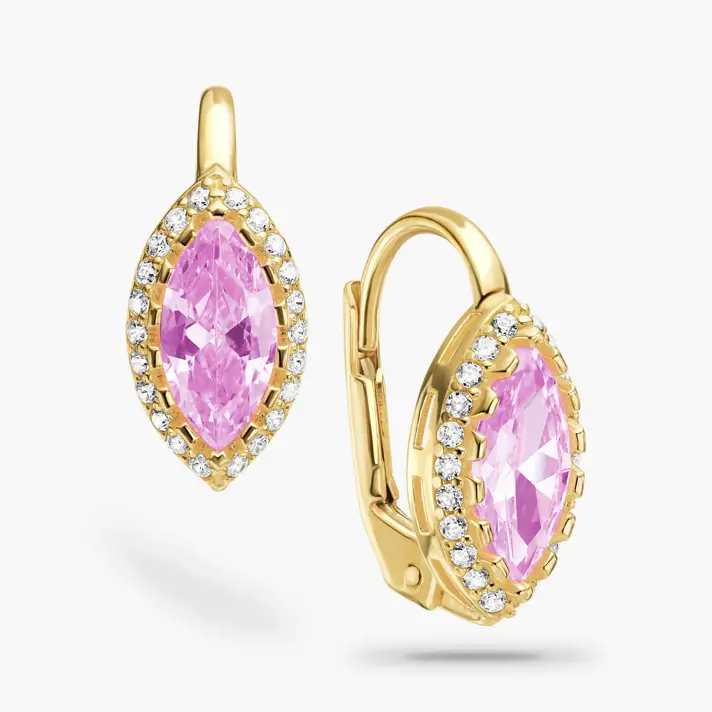 עגילי זהב 14K משובצים אבני חן וורודות בחיתוך מרקיזה יוקרתי מוקפות בזרקונים נוצצים. אורך העגילים 1.5 ס"מ ורוחבם 0.7 ס"מ.
