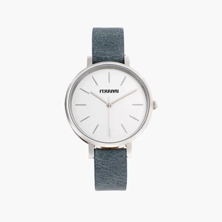 שעון FERRARI אופנתי לנשים, בעל לוח מט לבן , סימוני ספרות ומחוגים מוכספים, קופסה מוכספת בגימור מט ורצועת עור בגוון כחול בהיר. קוטר השעון 33 ס"מ