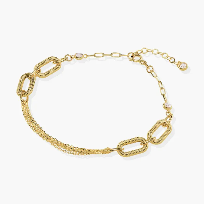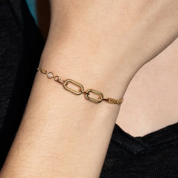 צמיד נטליה מזהב 14K בשילוב 4 חוליות אובליות דמויות צמה, שרשרת חוליות . אורך הצמיד 17.5 ס"מ עם אפשרות להארכה ב 3 ס"מ נוספים.