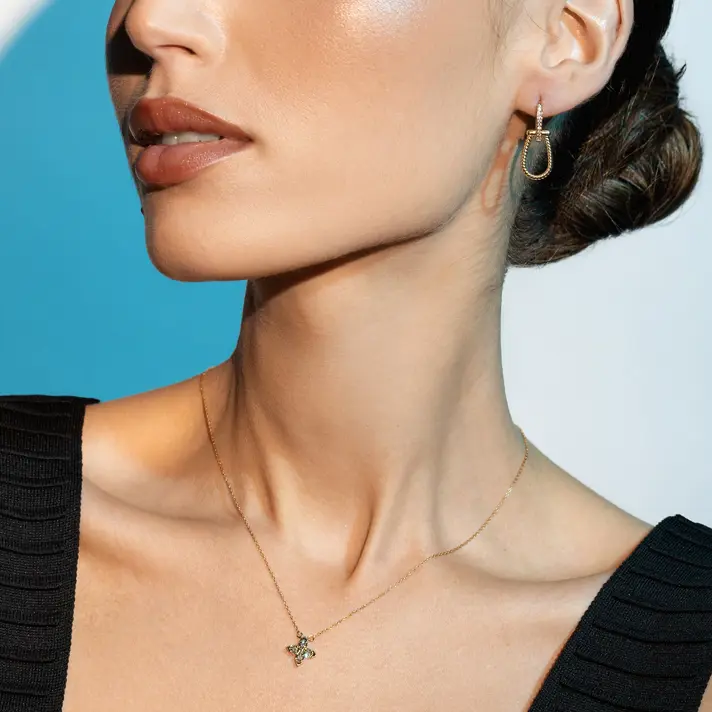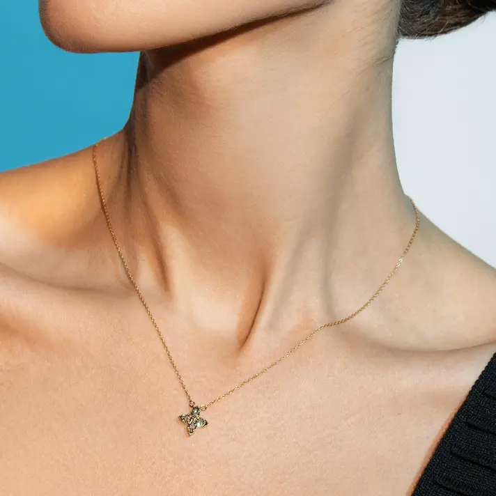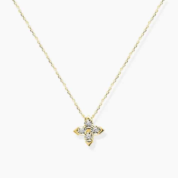 תליון זהב 14K בצורת פרח משובץ ב 4 יהלומים טבעיים ונוצצים מוקפים מסגרת זהב בגימור לייזר מנצנץ . קוטר התליון 1 ס"מ.