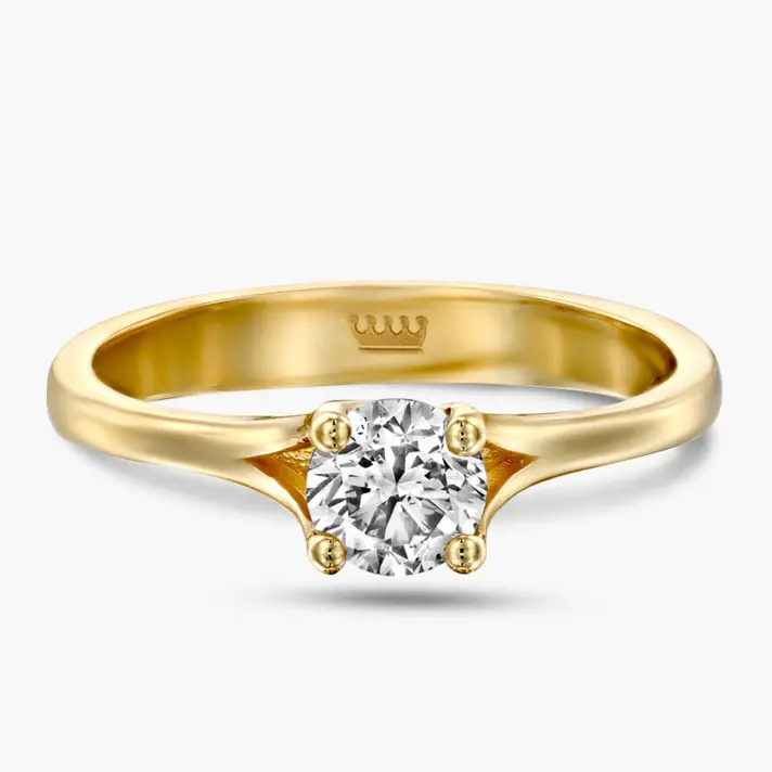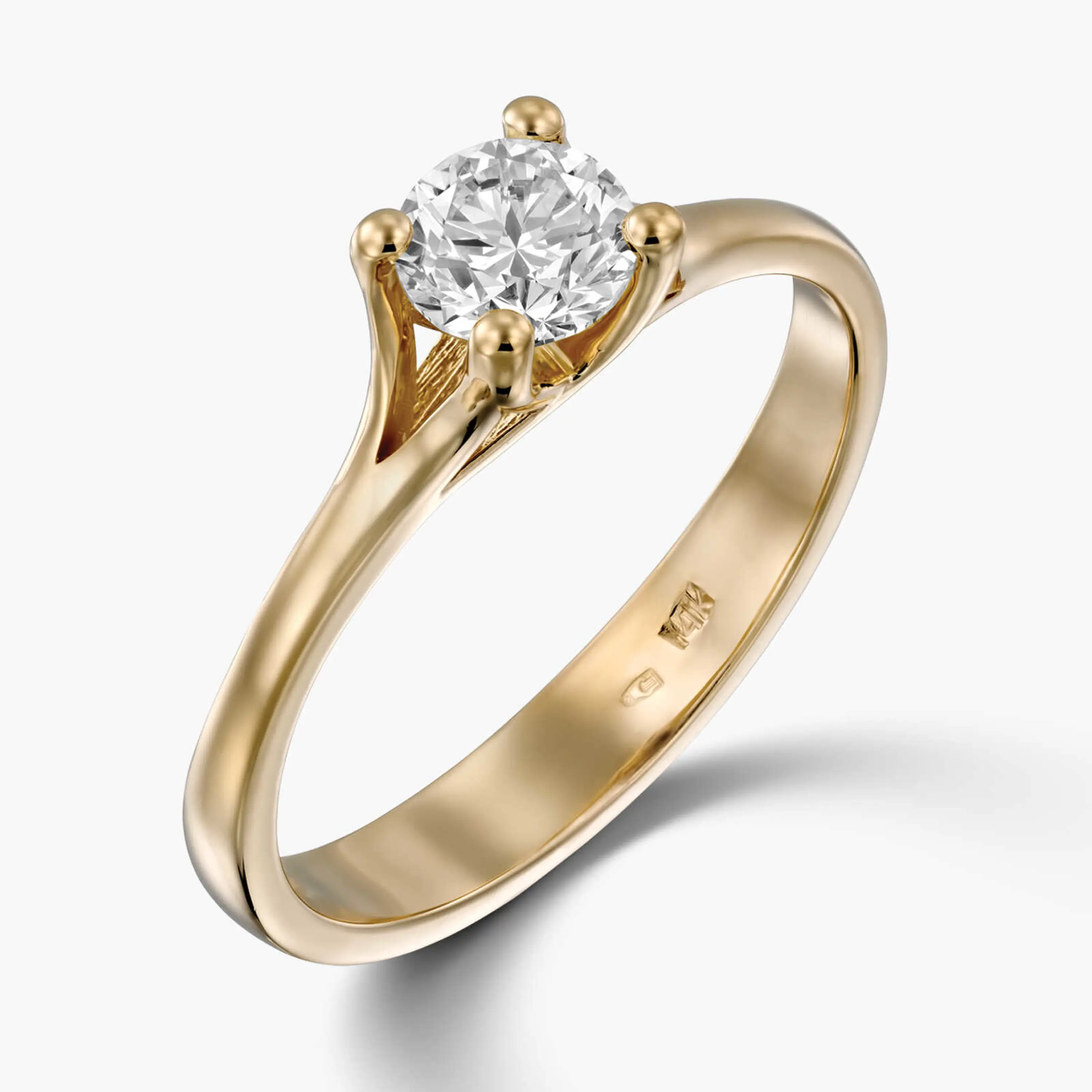 טבעת זהב צהוב 14K המשובצת ביהלום מרכזי גדול ( חצי קראט ומעלה) המוחזק באמצעות 4 שני זהב - טבעת מושלמת להצעת נישואין מרגשת! לצפיה בטבעות ובגדלי היהלום הזמינים במלאי יש ללחוץ על מלאי בסניפים.עובי הטבעת 1.5 מ"מ, גובה אבן מעל הטבעת- 4.5 מ"מ