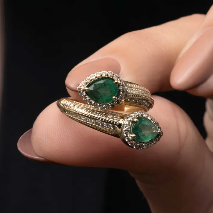 טבעת זהב עם שתי אבני אמרלד בחיתוך טיפה