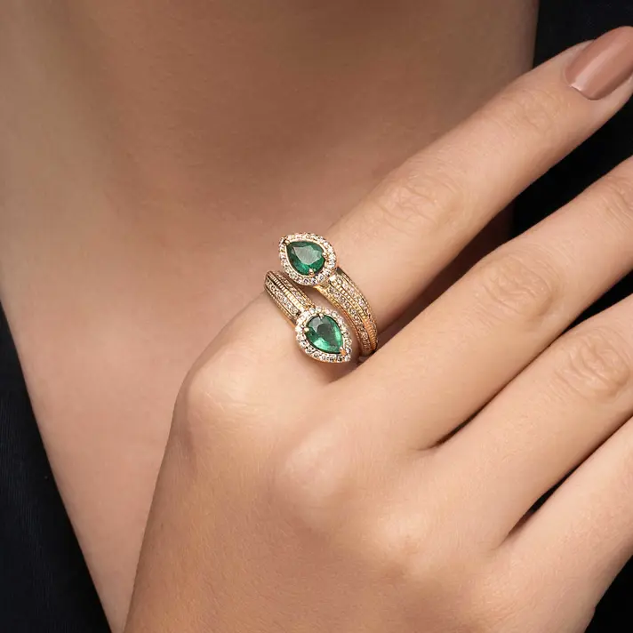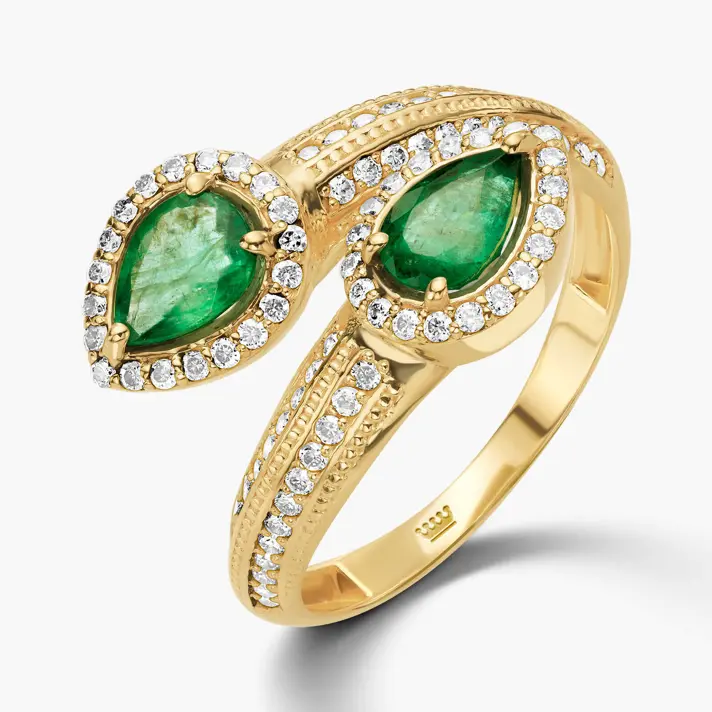 טבעת זהב 14K המעוצבת עם שתי אבני אמרלד בחיתוך טיפה המתלפפות על האצבע ומוקפות ב 88 יהלומים טבעיים ונוצצים.