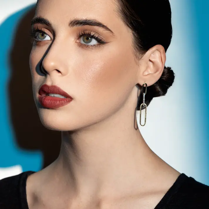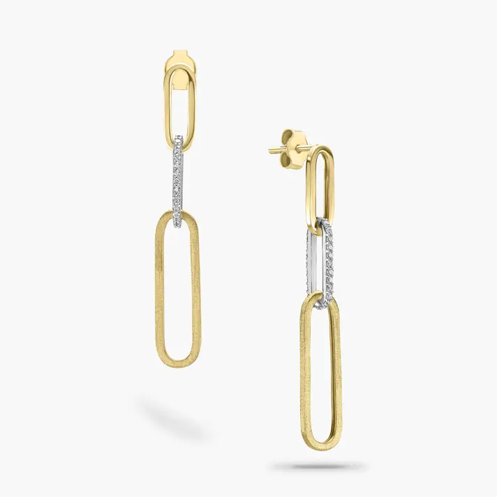 עגילי זהב 14K אלגנטיים באורך 5.2 ס"מ המורכבים מ-3 חוליות אובליות עם חוליה מרכזית משובצת זרקונים נוצצים.