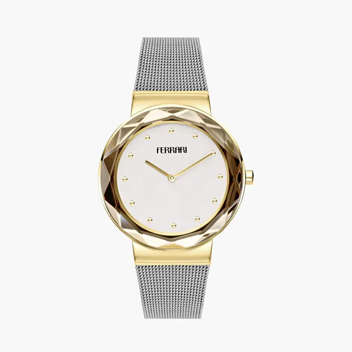 שעון Ferrari לנשים עם חוגה בחיתוך יהלום בגוון זהב לוח כסוף עם סימוני ספרות ומחוגים מוזהבים. לשעון רצועת Mesh גמישה ומוכספת. קוטרו 34.6 מ"מ והוא עמיד למים לשטיפת ידיים אך לא לבריכה או למקלחת.