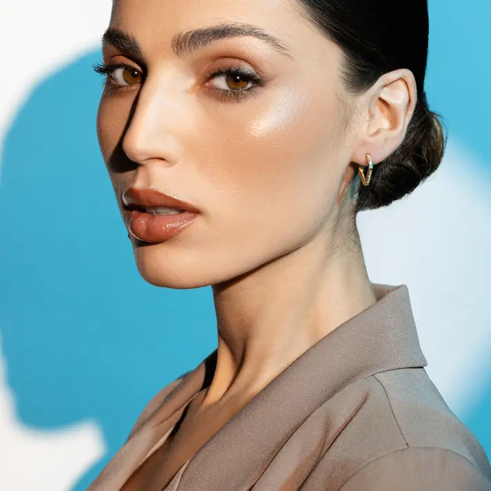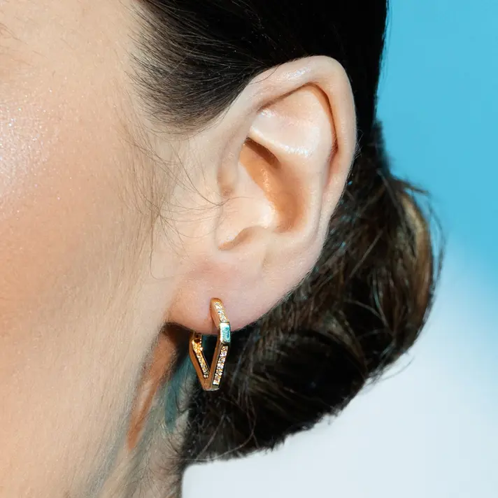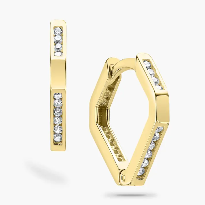 עגילי זהב 14K בעלי 6 צלעות משובצים בזירקונים נוצצים. מידות העגילים 1.6*1.8 ס"מ.