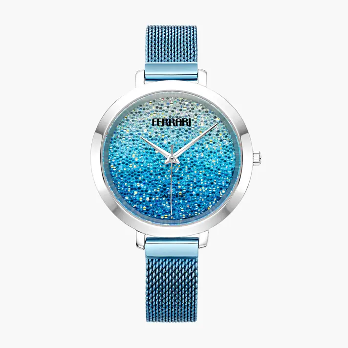שעון FERRARI מהמם בעל לוח יחודי המשובץ באבני קריסטל נוצצות בגווני כסף תכלת וכחול, בעל מחוגים וקופסת שעון כסופים ורצועת Mesh כחולה. קוטר השעון 36 מ"מ והוא עמיד למים לשטיפת ידיים אך לא לבריכה או למקלחת.