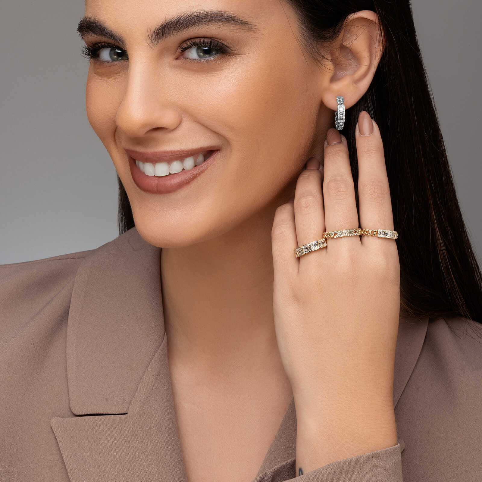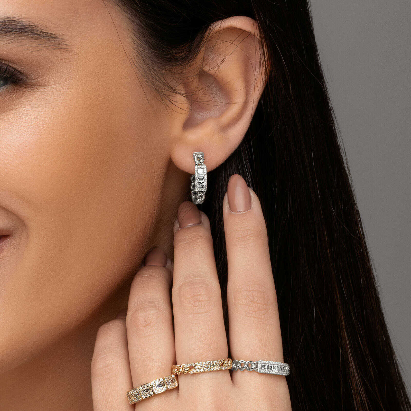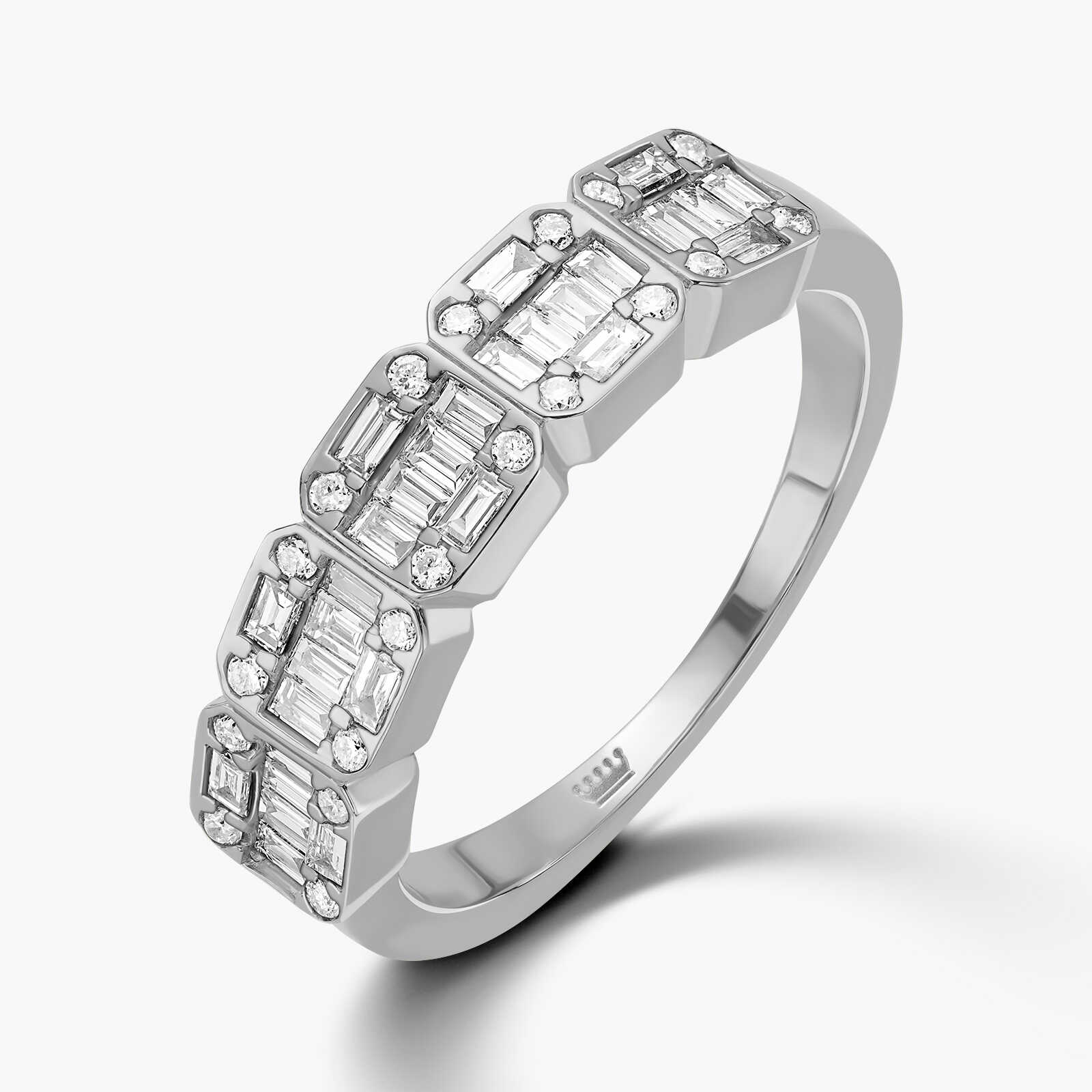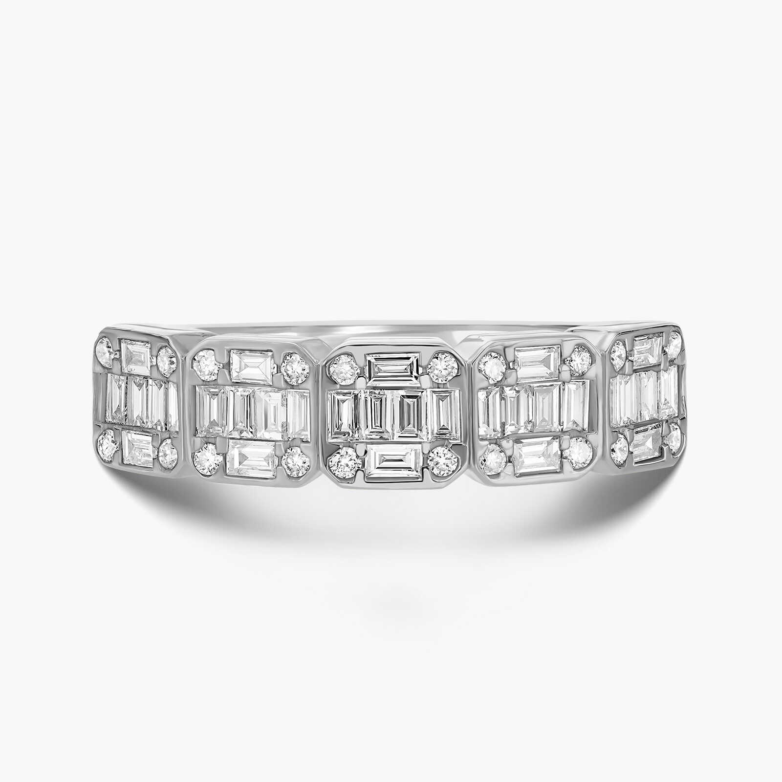 טבעת זהב 14K המעוצבת עם 5 ריבועים משובצים 50 יהלומים טבעיים ונוצצים בחיתוך באגט יוקרתי ועגול.