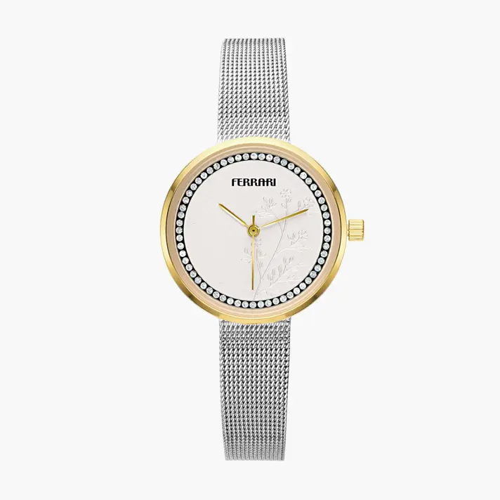 שעון Ferrari לנשים עם לוח כסוף הכולל עיטור עדין של פרחים ומוקף באבני זירקון נוצצות. מחוגי השעון וקופסת השעון בגוון זהב ורצועת השעון מסוג Mesh גמיש - בגוון כסף. קוטר השעון 30 מ"מ והוא עמיד למים לשטיפת ידיים אך לא לבריכה או למקלחת.