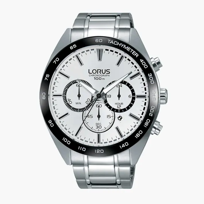 שעון LORUS מבית SEIKO בעל לוח בצבעי שחור ולבן הכולל תאריכון, סטופר ושעון 24 שעות. לשעון סקאלה שחורה וצמיד מתכת איכותי. השעון עמיד במים עד ל 100 מטר עומק.
