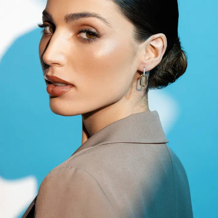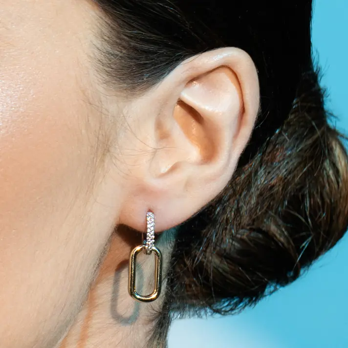 עגילי זהב ORA 14K משובצים בזירקונים נוצצים. גודל העגילים 2.5*0.8 ס"מ.