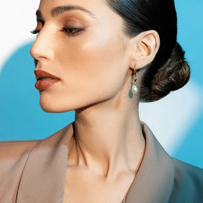 עגילי זהב 14K Daniel המעוצבים עם משולש מוזהב ועליו תלויה פנינה בקוטר 10 מ"מ. אורך העגילים 3.5 ס"מ.