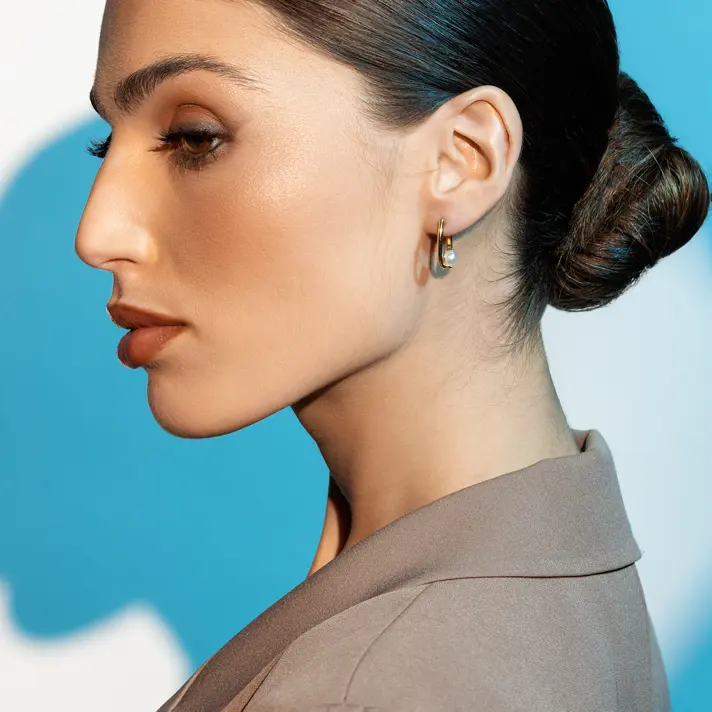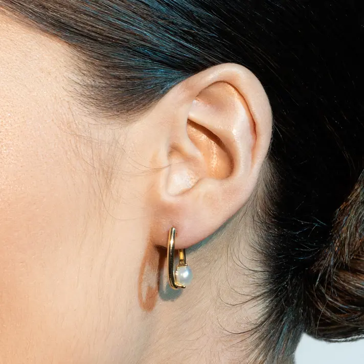 עגילי זהב PIANO 14K המשובצים בפנינה לבנה בקוטר 6 מ"מ. מידות העגילים 1.2*1.8 ס"מ.