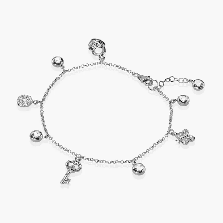 צמיד זהב 14K ועליו 9 צ'ארמים בצורות שונות משובצים זירקונים. אורך הצ'ארם 17.5 ס"מ ועוד 2.5 ס"מ הניתנים להארכה.