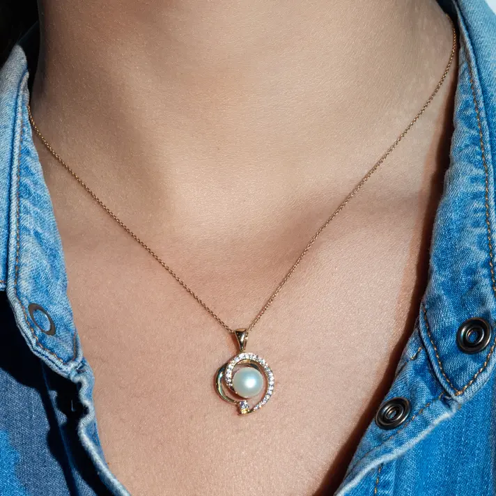 תליון זהב 14K בשיבוץ זרקונים נוצצים ובשילוב פנינה טבעית בגודל 8 מ"מ שגדלה במים מתוקים. גובה התליון 2.4 ס"מ
