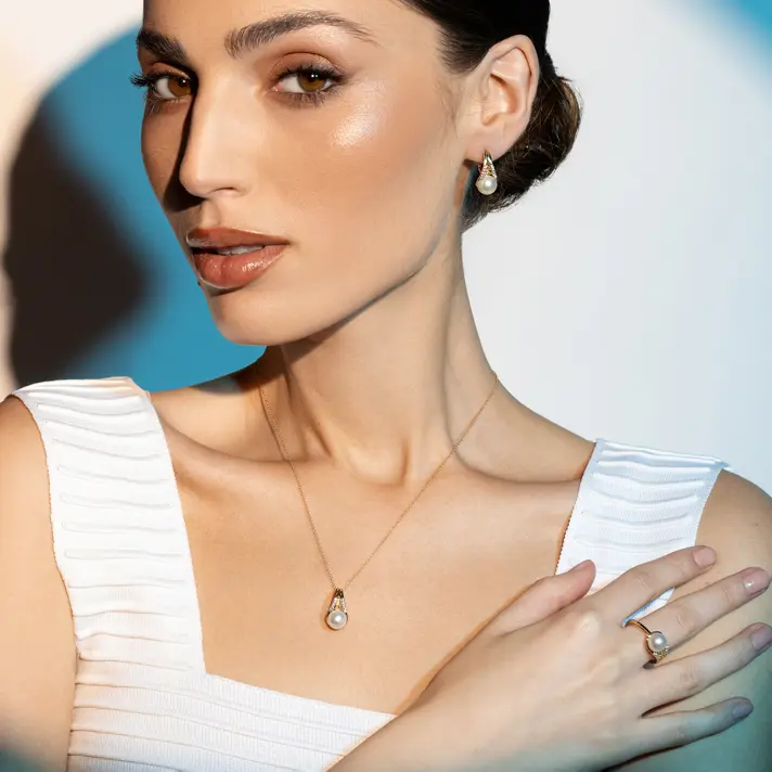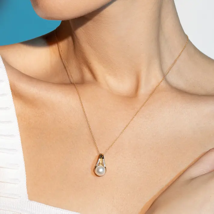 תליון זהב 14K בשיבוץ זרקונים נוצצים ובשילוב פנינה טבעית בגודל 8 מ"מ שגדלה במים מתוקים. גובה התליון 2 ס"מ