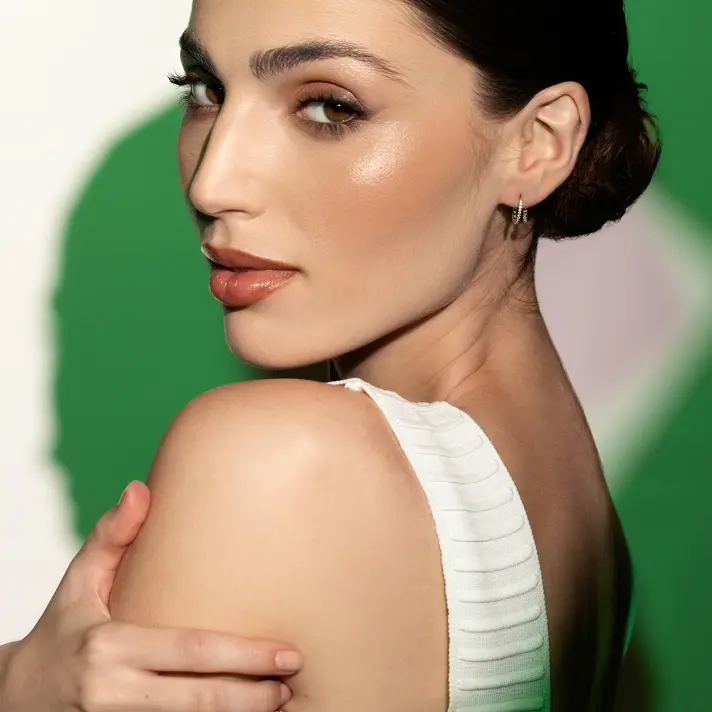 עגילי זהב 14K במראה עגיל כפול, משובצים בזרקונים נוצצים. מידות העגילים 1.3*0.7 ס"מ