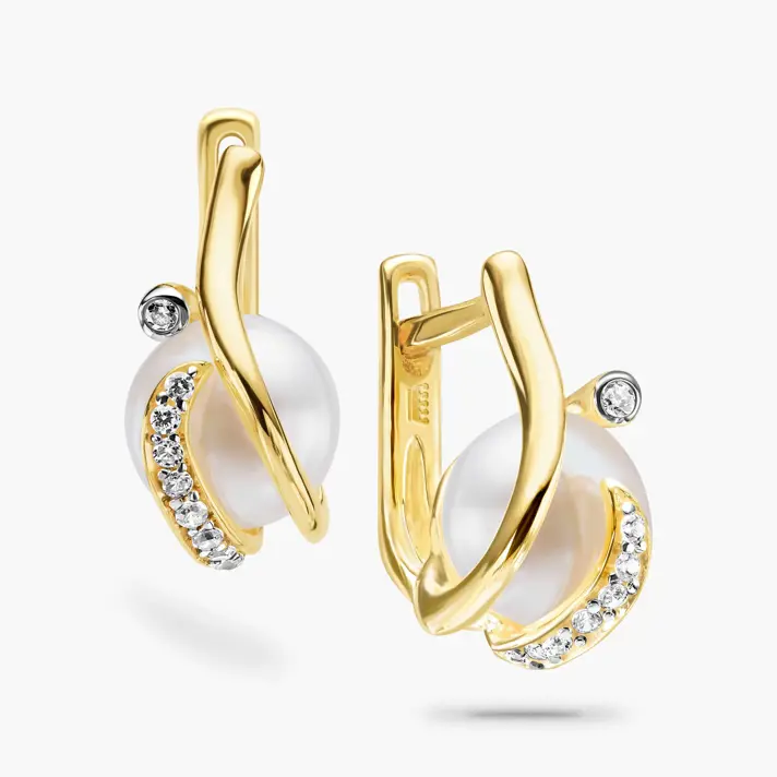 עגילי זהב 14K בשיבוץ זרקונים נוצצים ובשילוב פנינה טבעית בגודל 8 מ"מ שגדלה במים מתוקים. גובה העגילים 1.6 ס"מ