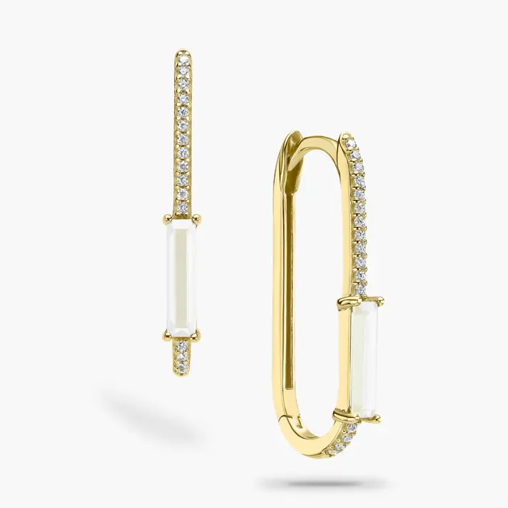עגילי זהב 14K המעוצבים כמלבן מעוגל בשיבוץ אבני זירקון נוצצות ושקופות ואבני חן לבנות. אורך העגילים 2.7 ס"מ ורוחבם 1.2 ס"מ.