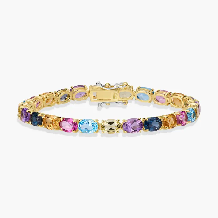 צמיד זהב 14K המשובץ ב 25 אבני חן יוקרתיות בחיתוך אובאלי מרשים. סוגי אבני החן המשובצים בצמיד: טופז, בלו טופז, אמטיסט, סיטרין, טופז לונדון בלו ולמון קוורץ.