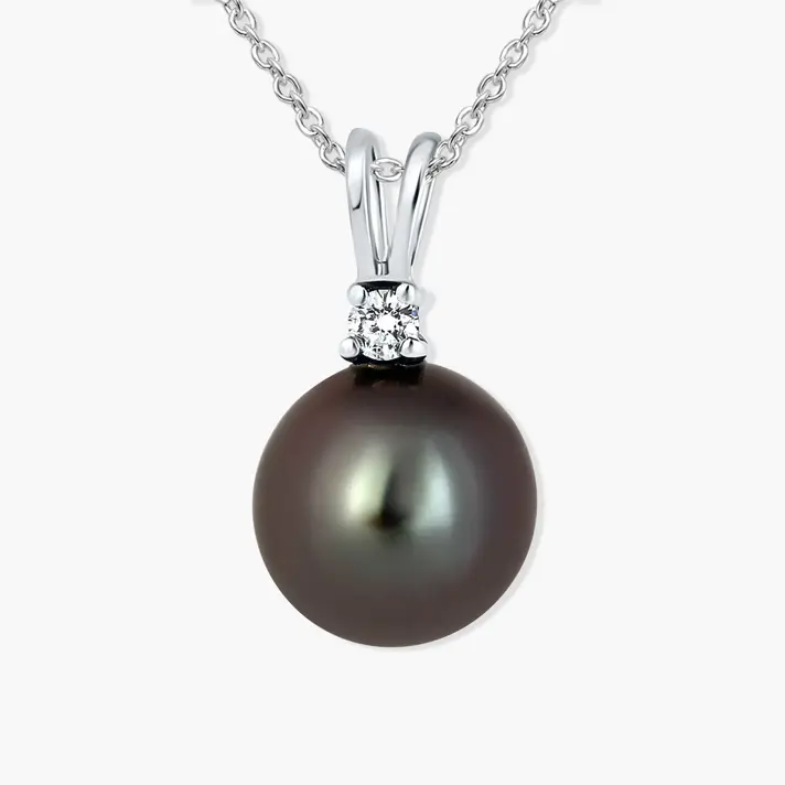 תליון זהב 14K לבן בשיבוץ פנינת טהיטי עגולה ממים מלוחים, בגוון שחור טבעי בגודל 10 מ"מ ויהלום טבעי ונוצץ