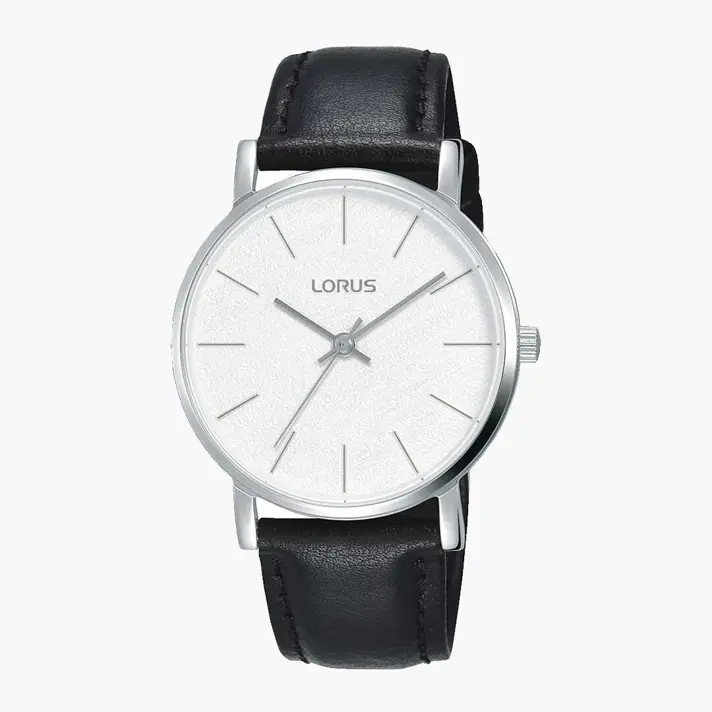 שעון LORUS מבית SEIKO יפן בעל לוח לבן בעיבוד מחוספס, קופסת שעון בגוון כסף ורצועת עור איכותית בצבע שחור. השעון עמיד למים וקוטרו 34 מ"מ.