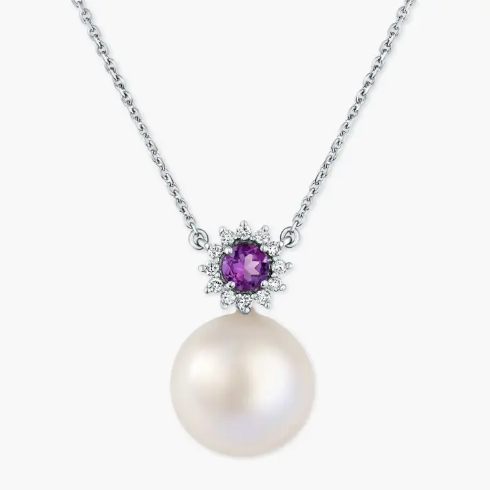 תליון זהב 14K מקולקציית אוצרות הטבע שכולה יצירה של הטבע עם שיבוץ אבן חן מרכזית מסוג אמטיסט, 12 יהלומים טבעיים ונוצצים ופנינה טבעית שגדלה במים מתוקים.