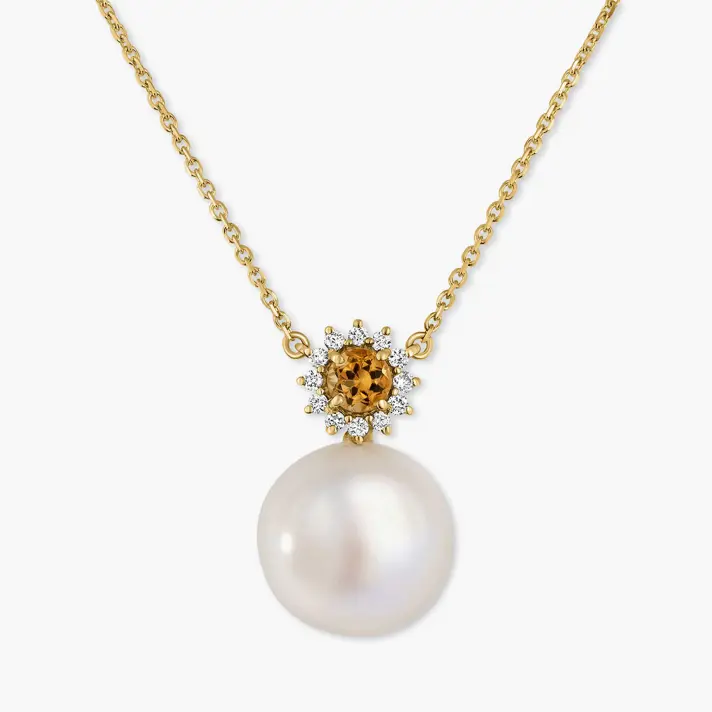 תליון זהב 14K מקולקציית אוצרות הטבע שכולה יצירה של הטבע עם שיבוץ  אבן חן מרכזית מסוג סיטרין,  12 יהלומים טבעיים ונוצצים ופנינה טבעית שגדלה במים מתוקים.